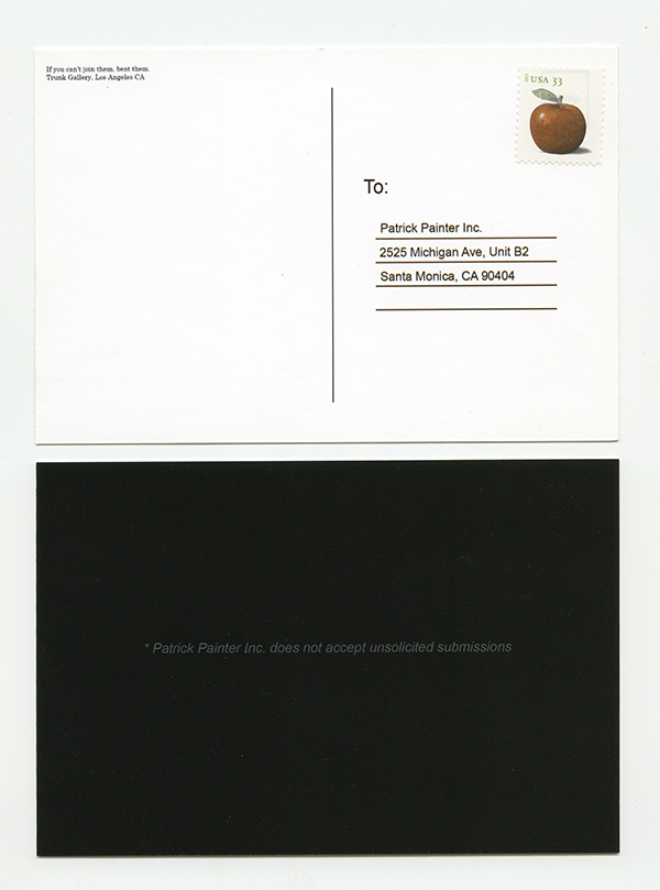 Installation Description: “We do not accept unsolicited submissions.” is an installation consisting of 36 sets of limited edition postcards‚ postage stamps and attendant. Focusing on Los Angeles-based commercial art galleries‚ sets of postcards were created with gallery addresses on one side and its corresponding submission policy on the other. The postcards were for sale through the run of the art exhibition‚ “If you can't join them, beat them.” If participants elected to mail their postcard(s)‚ pens and an on-site drop box were provided.